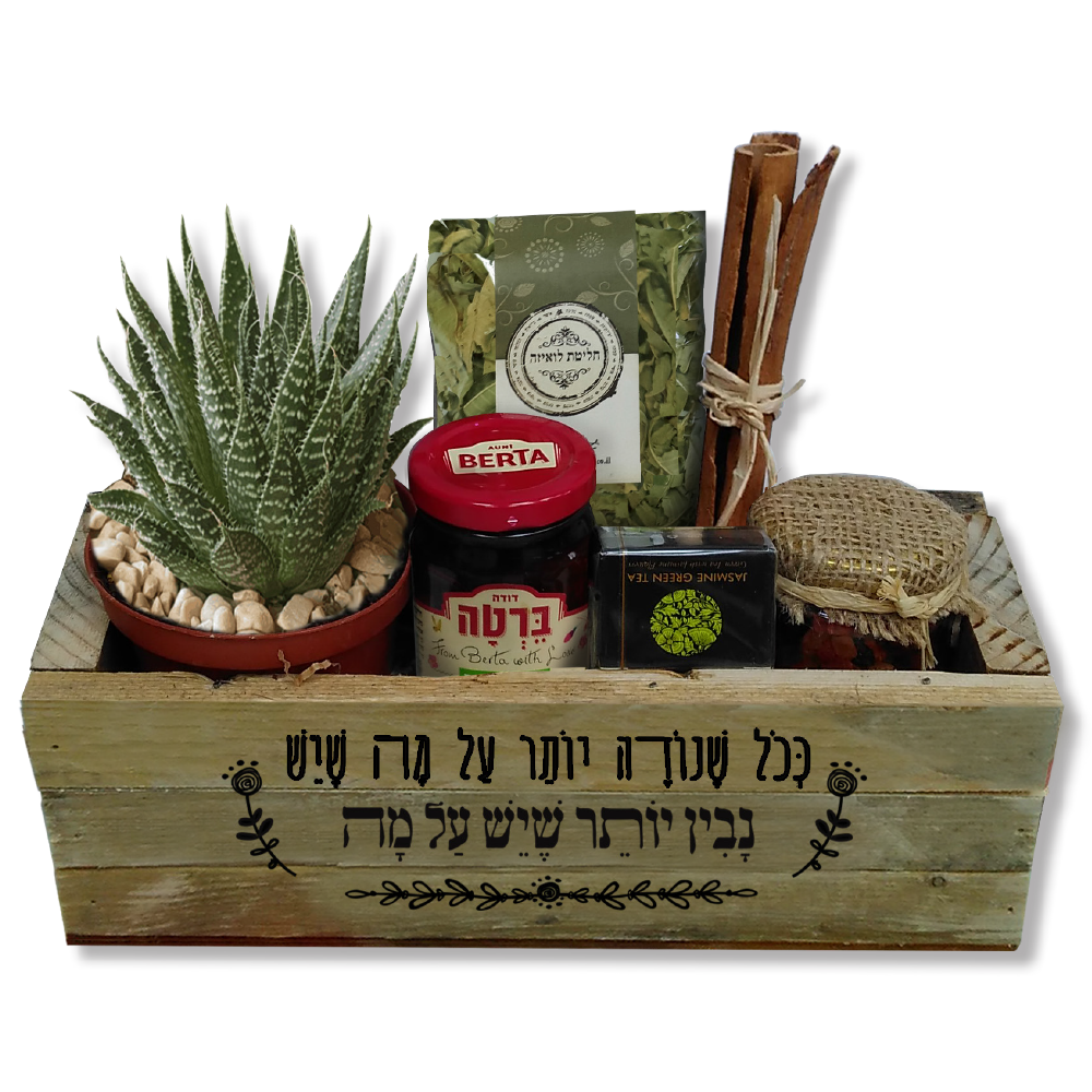 מארז עץ המכיל עציץ סקולנט, חרוסת 120 גרם, חליטת צמחים,חליטת פירות, מקלות קינמון ארוכים ושקית תה מבית סרמוני