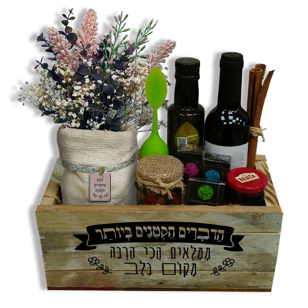 מארז עץ המכיל יין 375 מל', שמן זית 250 מל', עציץ בטון דמוי שק עם פרחים מיובשיםבשילוב עם צמחים מלאכותיים