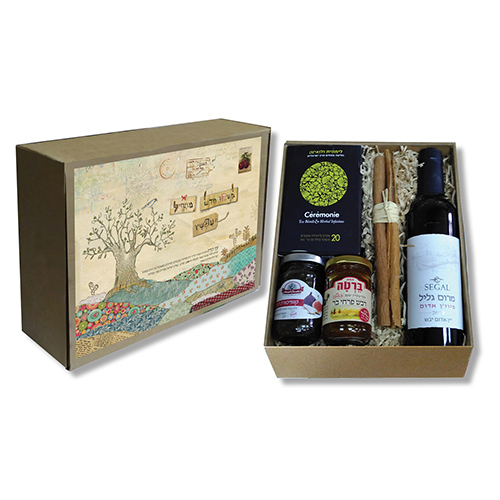 מארז לחג המכיל בקבוק יין 375 מל', 20 שקיקי תה מבית סרמוני, דבש 120 גרם, ממרח מתוק 120 גרם ומקלות קינמון