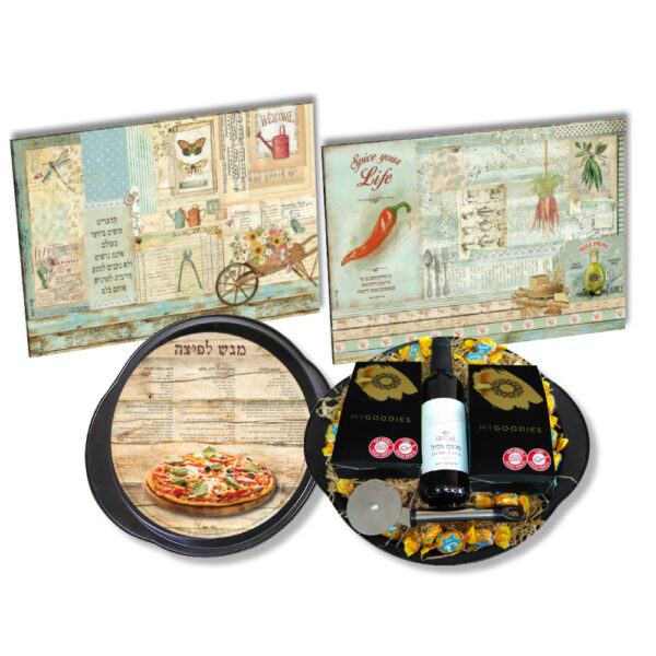קרש חיתוך מזכוכית, מגש לפיצה משפחתית, גלגלת לחיתוך, יין 375 מ"ל, 2 מארזי שוקולדים בטעמים שונים: צימוקיםחמוציותבוטנים בציפוי שוקולד וכ-17 סוכריות דבש גודל הקרש 35×25 ס"מ, שוקולדים לפי הקיים במלאי