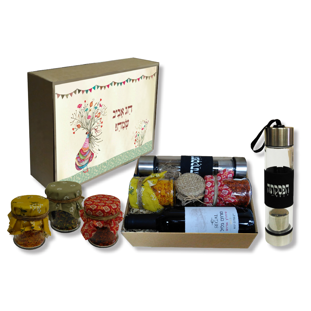 מארז קרטון מעוצב לפסח המכיל יין 375 מל', בקבוק חליטה, חליטת פרי ו-2 תערובות לבישול