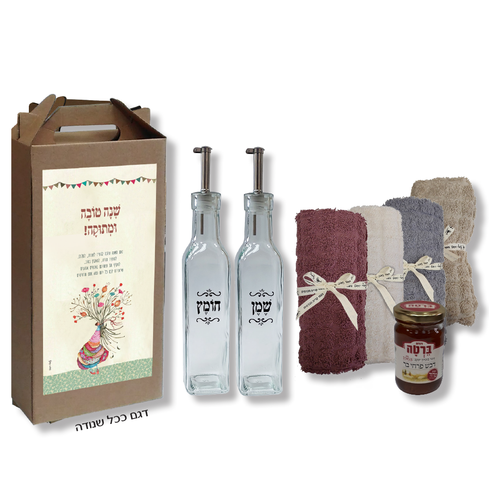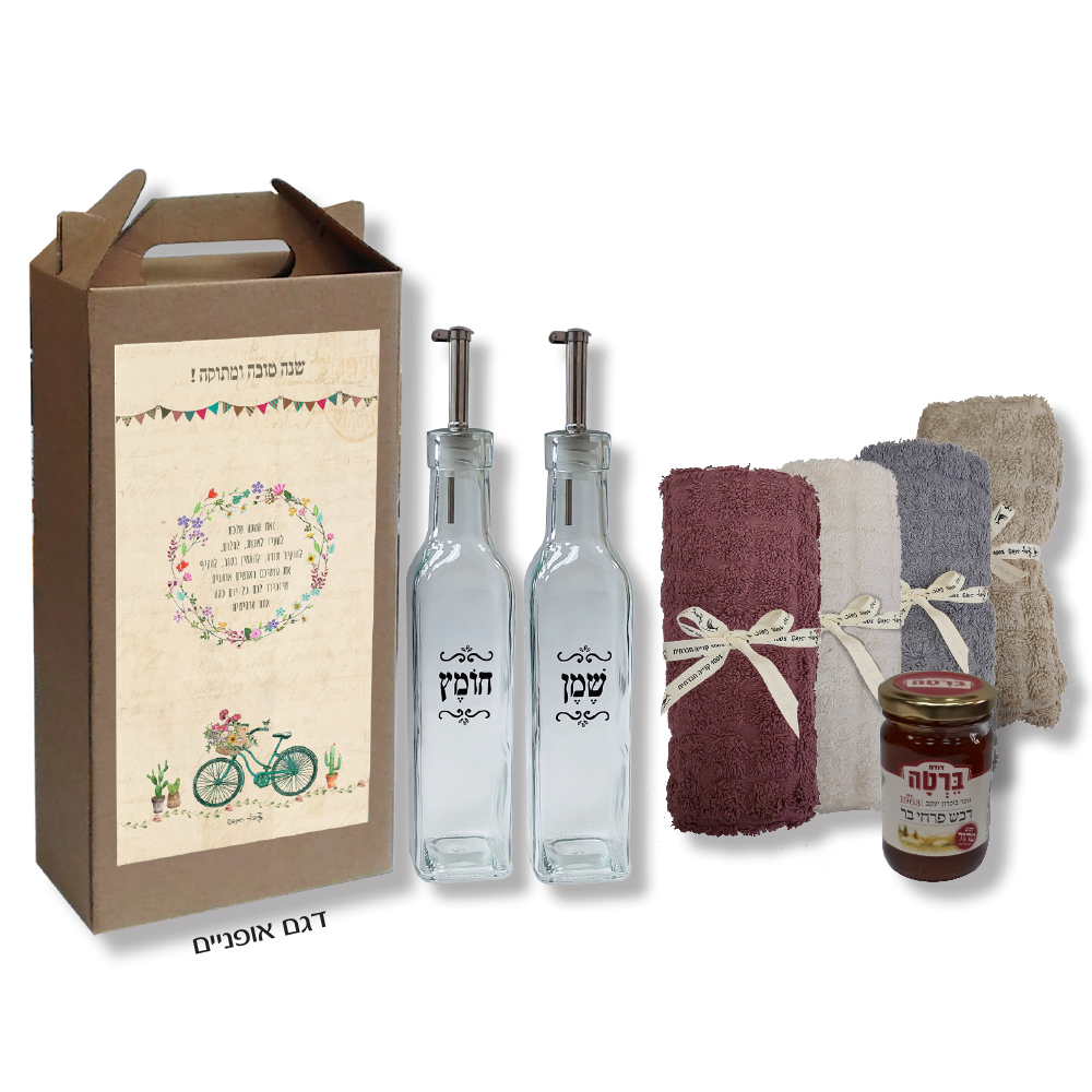 מארז המכיל 2 בקבוקים לשמן ולחומץ, דבש 120 גרם ומגבת מטבח המגבת מגיעה בגוונים שונים בהתאם לקיים במלאי, גודל המארז 34×17 ס”מ