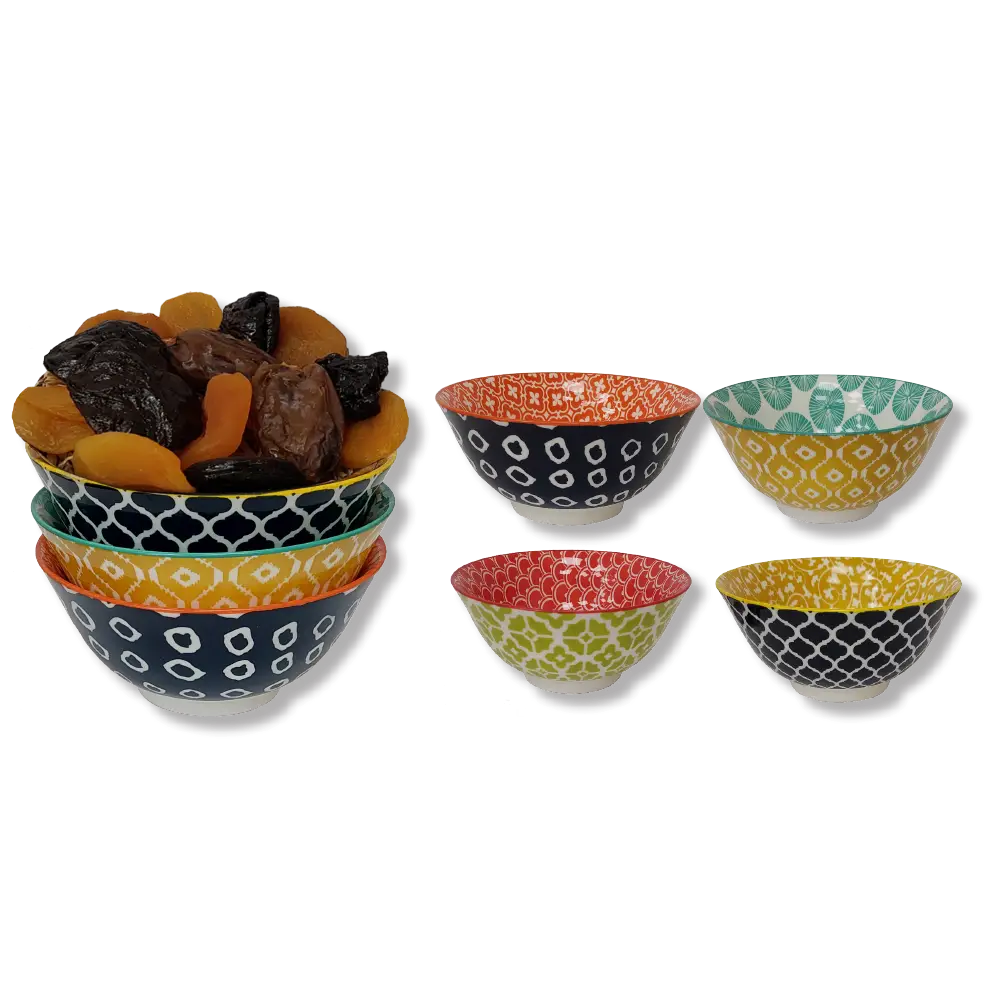 מארז הכולל 3 קערות מרק צבעוניות בגודל 15.5×7 ס"מ, מלאות ב-180 גרם פירות יבשים מובחרים.