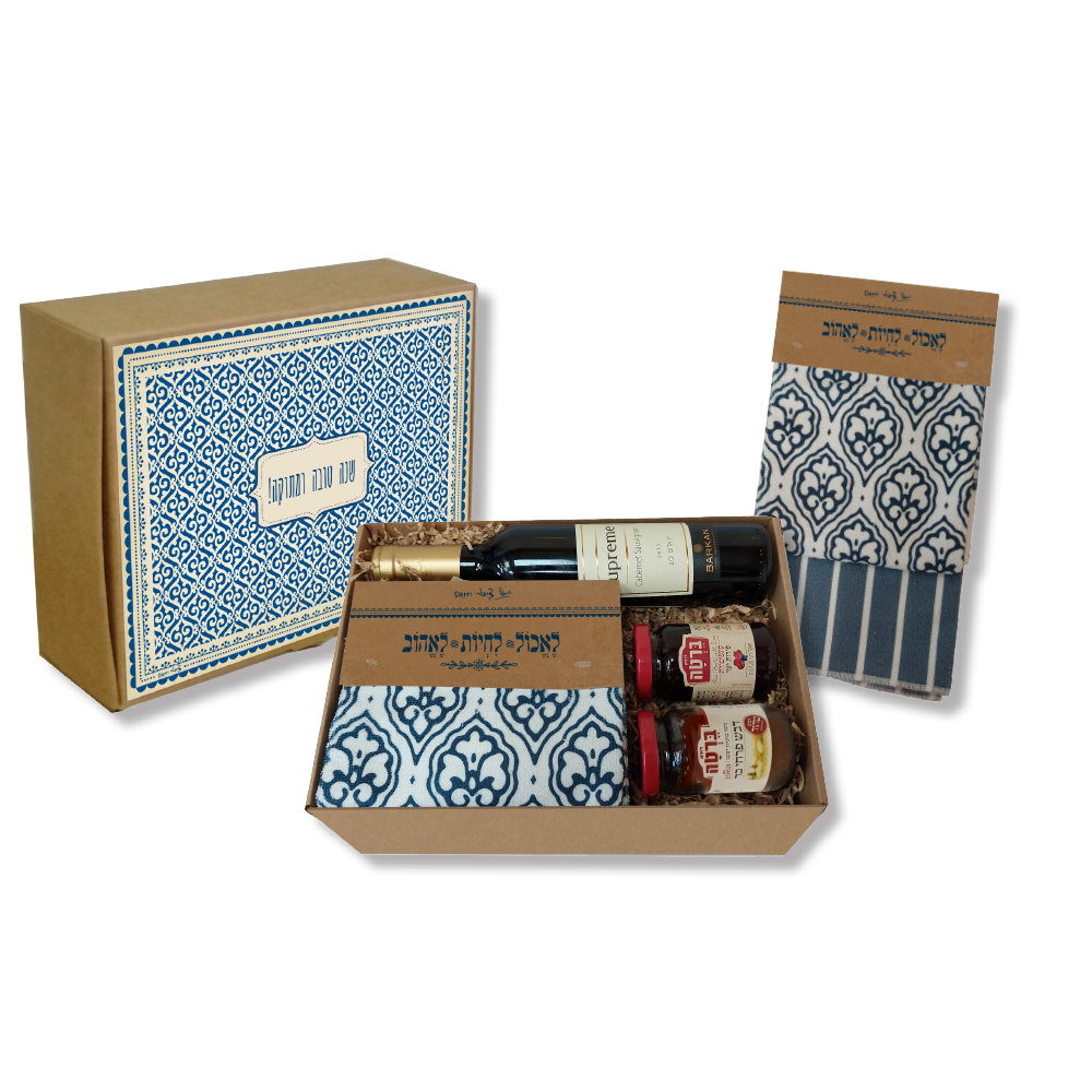 מארז בגודל 27×19 ס"מ הכולל בקבוק יין 375 מ"ל, זוג מגבות מטבח (60×38 ס"מ), דבש 120 גרם וממרח מתוק 120 גרם. עיצוב קומפקטי ונקי, אך מלא תכולה ושימוש אמיתי.
