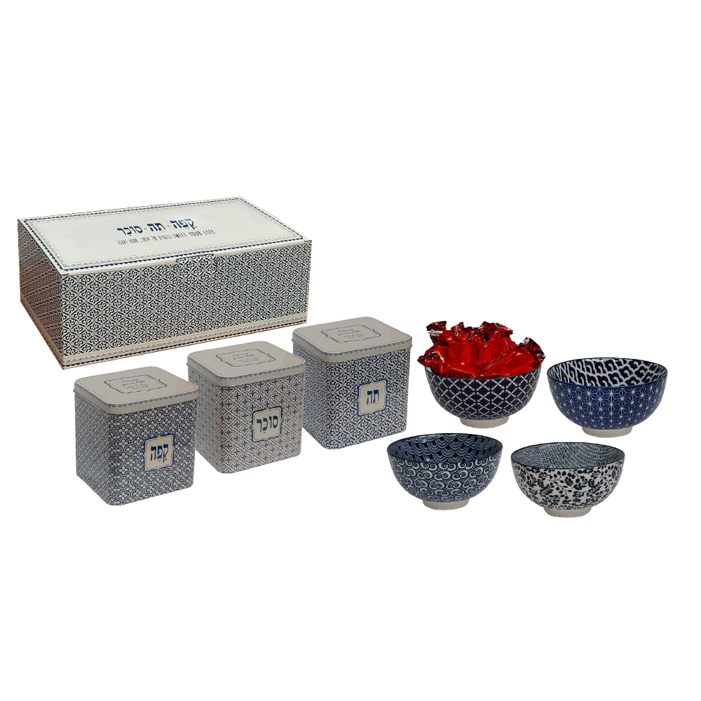 מארז בגודל 33×13×11 ס"מ הכולל: ▪ 3 קופסאות פח מעוצבות לקפה, תה וסוכר ▪ 3 קעריות קרמיקה בגודל 11.5×6 ס"מ ▪ 8 פרלינים