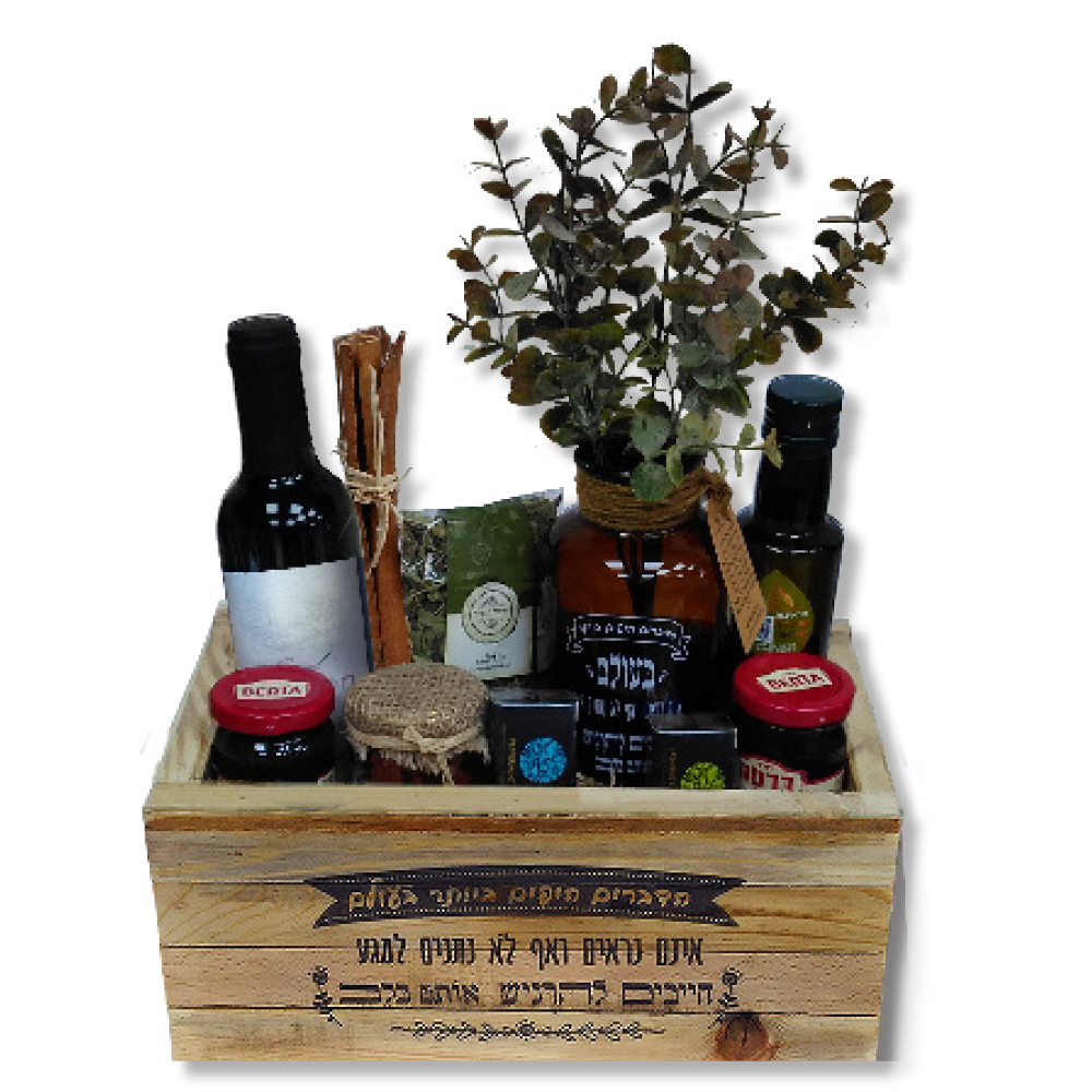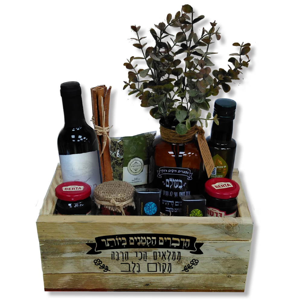 מארז עץ המכיל יין 375 מל', שמן זית 250 מל', אגרטל מזכוכית חומה עם אקליפטוס מלאכותי,