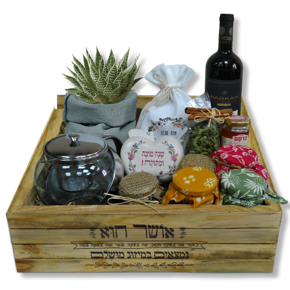 מארז עץ המכיל יין 750 מל', קנקן חליטה, עציץ בטון דמוי שק עם סקולנט, 3 תערובות לבישול בטעמים שונים,