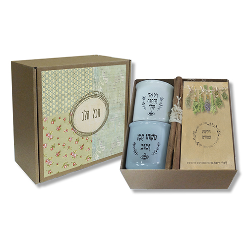 מארז המכיל חליטת צמחים, 2 ספלי וינטג' ומקלות קינמון מידת המארז 20×20 ס"מ, הספלים מגיעים בכתובים שונים בהתאם לקיים במלאי