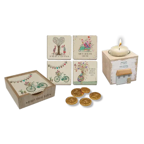 סטנד עץ עם 4 תחתיות (10×10 ס"מ), סטנד נר מרובע (8x8x8 ס"מ) ו־5 מטבעות שוקולד. מתנה חגיגית עם שילוב של שימושיות, רוגע ומתיקות.