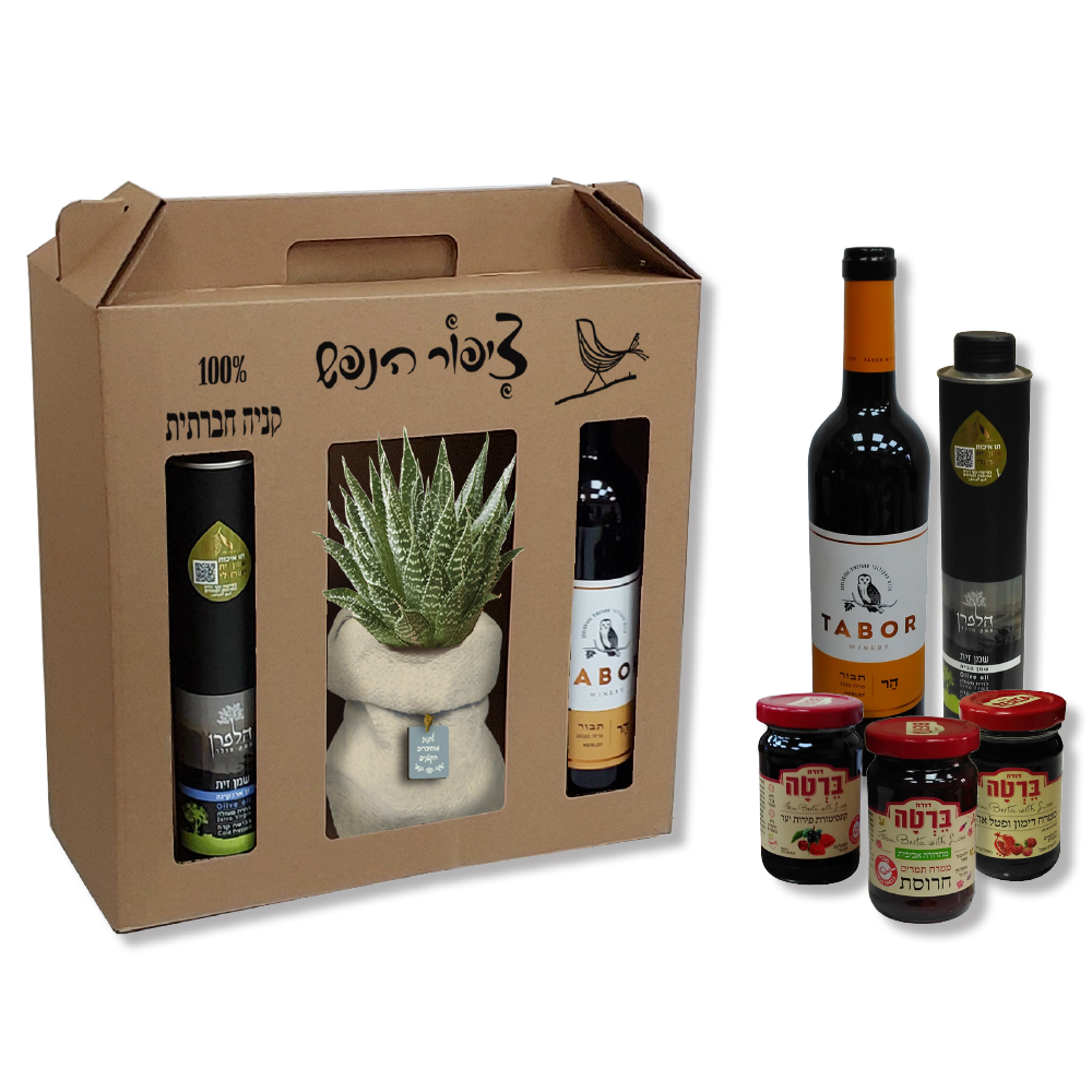 מארז המכיל יין תבור 750 מל', שמן זית בגליל פח 500 מל', 2 ממרחים מתוקים 120 גרם, חרוסת 120 גרם ועציץ בטון דמוי שק עם סקולנט