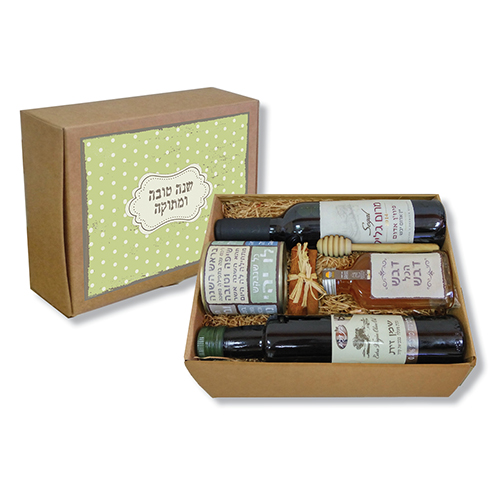 המארז עם שמן זית 250 מ"ל, יין 375 מ"ל, פחית במילוי סוכריות דבש, דבש בבקבוק ליקר 130 מל', כפית לדבש ומקלות קינמון מידת הקופסא 25×19 ס"מ, גובה הפחית 7 ס"מ