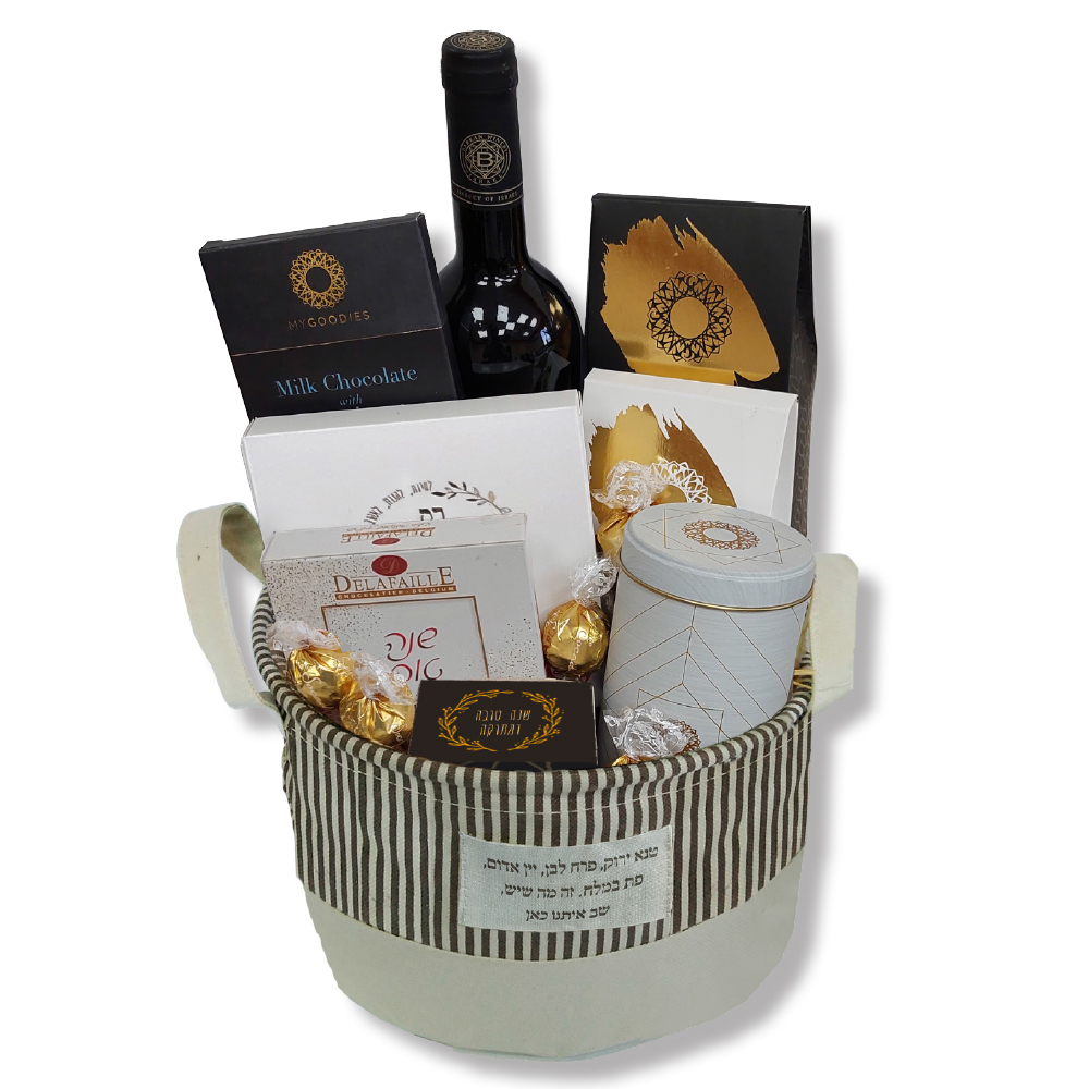 סלסלה המכילה יין 750 מ"ל, פחית פרליני שוקולד גנדויה חלב עם אגוזי לוז שלמים,2 מארזי שוקולד בטעמים שונים: צימוקים/חמוציות/בוטנים בציפוי שוקולד, שוקולד חלב עם שברי אגוזי לוז, מארז נפוליטנים בטעמים שונים, מארז פרליני רבוע שוקולד מועשרים במילוי קרם שקדים משובח, מיניבונבונירה ו-5 פרלינים מידת הסלסלה 15×19 ס”מ