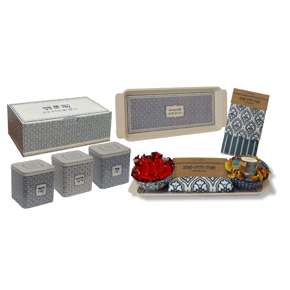 מארז בגודל 33×13×11 ס"מ הכולל: ▪ 3 קופסאות פח לקפה, תה וסוכר ▪ מגש עוגה מבמבוק בשילוב מלמין – 39×15 ס"מ עם 2 קעריות במילוי 8 פרלינים, דבשית 30 גרם ו-9 סוכריות דבש ו-2 מגבות מטבח