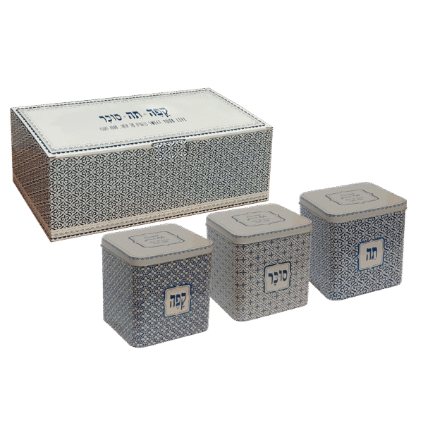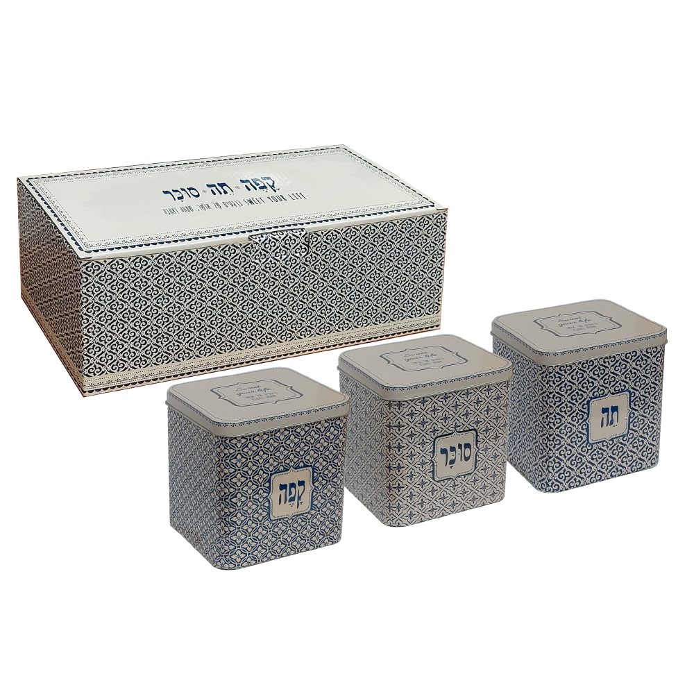 מארז באורך 33 ס"מ, הכולל 3 קופסאות פח מעוצבות לקפה, תה וסוכר – בגימור חגיגי ואסתטי. מתאים לשימוש יומיומי בבית או במשרד, מגיע באריזת מתנה איכותית.