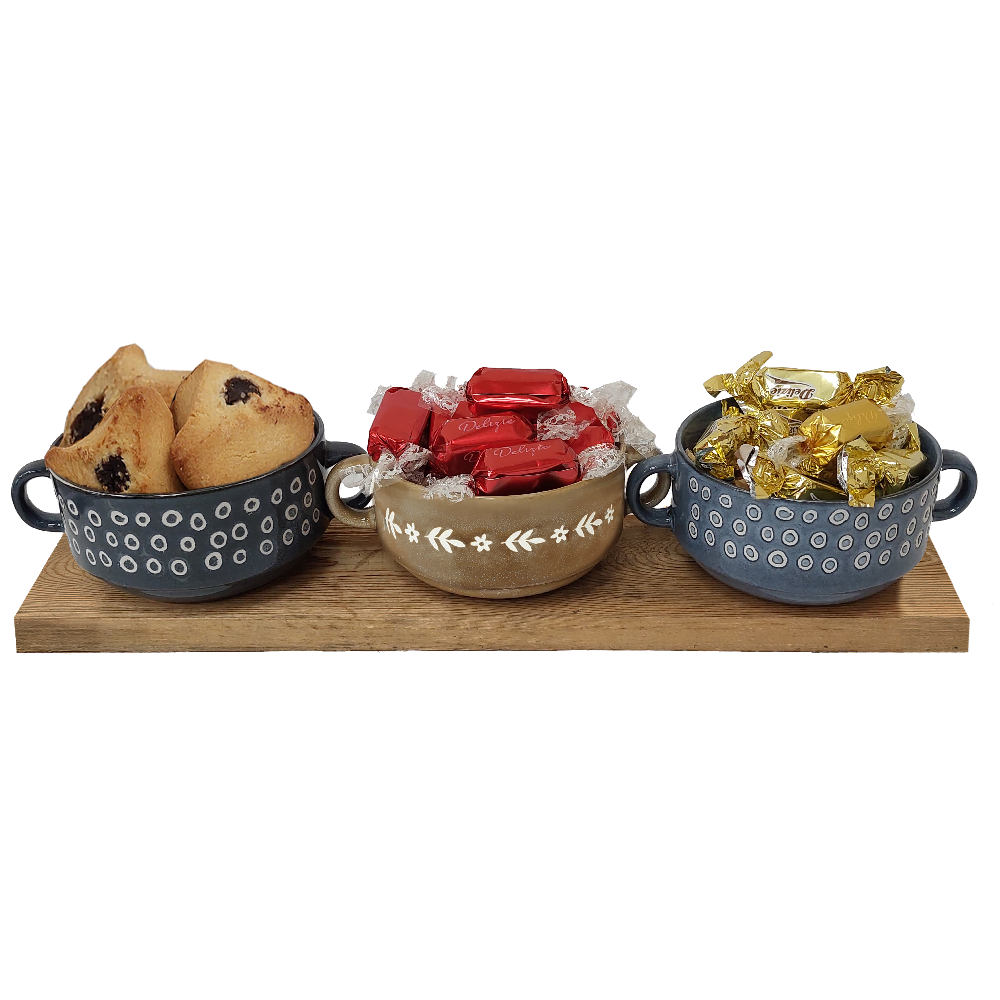 מארז מרהיב לפורים הכולל 3 קערות קרמיקה, עם 8 פרלינים איכותיים בכל קערה, ו- 3 אוזני המן חגיגיים.