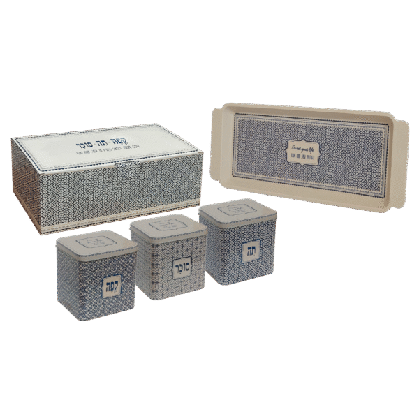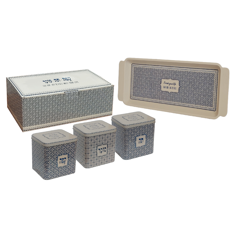 מארז בגודל 33×13×11 ס"מ הכולל: ▪ 3 קופסאות פח לקפה, תה וסוכר ▪ מגש עוגה עשוי במבוק בשילוב מלמין, בגודל 14.5×39.5 ס"מ