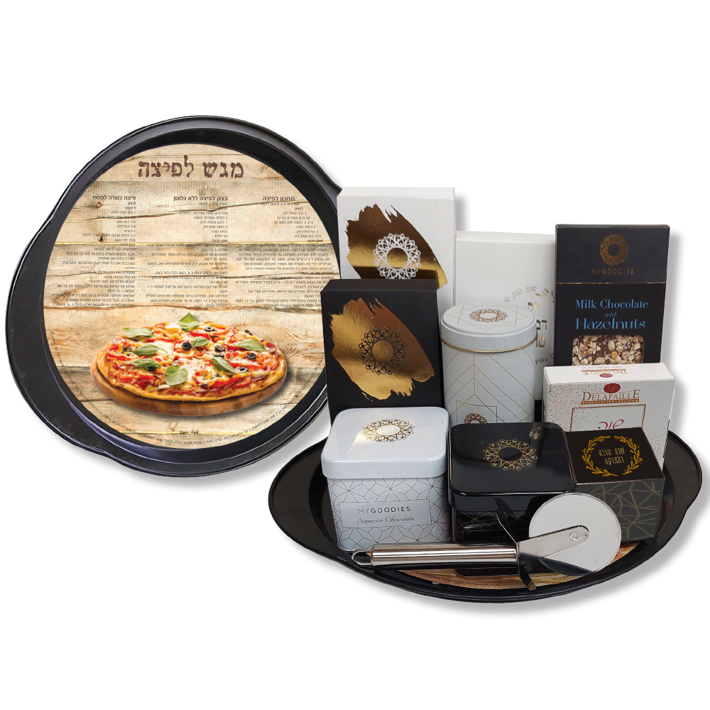 מגש פיצה המכיל 2 מארזי שוקולד בטעמים שונים: צימוקים/חמוציות/בוטנים בציפוי שוקולד, פחית פרלינים איכותיים במילוי קרם קרמל עם נגיעות מלוחות ושברי קרמל פריכים, פחית טרפלס במילוי קרם טרמיסו עשיר, פחית פרליני שוקולד גנדויה חלב עם אגוזי לוז שלמים, שוקולד חלב עם שברי אגוזי לוז, מארז נפוליטנים משוקולד בטעמים שונים, מארז פרליני רבוע שוקולד מועשרים במילוי קרם שקדים משובח, מיניבונבונירה וגלגלת לפיצה