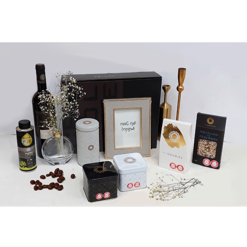 מארז המכיל יין ברקן 750 מ"ל, שמן זית 250 מ"ל בגליל פח, פחית פרלינים איכותיים במילוי קרם קרמל עם נגיעות מלוחות ושברי קרמל פריכים, פחית טרפלס במילוי קרם טרמיסו עשיר, פחית פרליני שוקולד גנדויה חלב עם אגוזי לוז שלמים, שוקולד חלב עם שברי אגוזי לוז ומארז שוקולד בטעמים שונים: צימוקים/חמוציות/בוטנים בציפוי שוקולד
