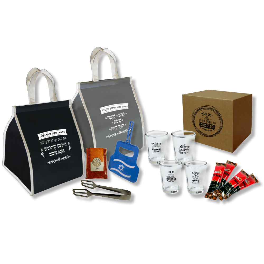 מארז המכיל צידנית משפחתית, מלקחיים למנגל, תערובות למנגל, נפנף, מארז 4 עם כוסות ו-4 קפה שחור אישי