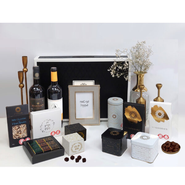 מארז המכיל יין ברקן 750 מ"ל, יין תבור 750 מ"ל, פחית פרלינים איכותיים במילוי קרם קרמל עם נגיעות מלוחות ושברי קרמל פריכים, פחית טרפלס במילוי קרם טרמיסו עשיר, פחית פרליני שוקולד גנדויה חלב עם אגוזי לוז שלמים, שוקולד חלב עם שברי אגוזי לוז, 2 מארז שוקולד בטעמים שונים: צימוקים/חמוציות/בוטנים בציפוי שוקולד, מארז נפוליטנים משוקולד מריר70% בטעמים: מריר/אגוז/תפוז, מארז פירמידות שוקולד חלב במילוי קרם שקדים משובח ומארז פרליני ריבוע שוקולד המועשרים במילוי קרם שקדים משובח