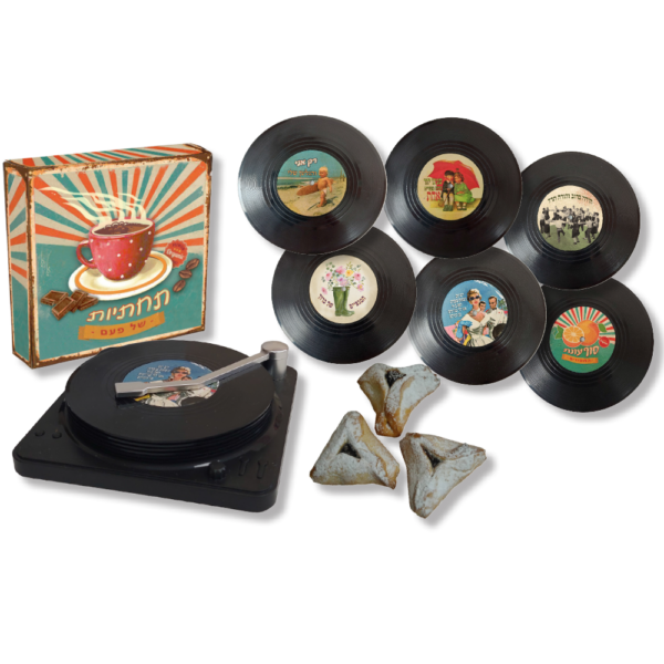 6 תחתיות תקליטים במארז פטיפון מעוצב ו-3 אוזני המן