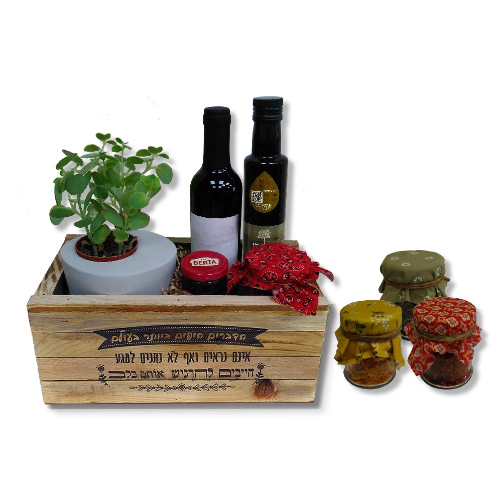 מארז עץ המכיל יין 375 מל', שמן זית 250 מל', סקולנט בעציץ בטון אובלי,תערובת לבישול וחרוסת 120 גרם