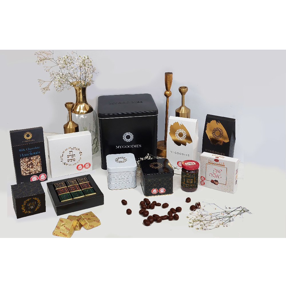 מארז פח המכיל פחית פרלינים איכותיים במילוי קרם קרמל עם נגיעות מלוחות ושברי קרמל פריכים. פחית טרפלס במילוי קרם טרמיסו עשיר, שוקולד חלב עם שברי אגוזי לוז, מארז פרליני ריבוע שוקולד המועשרים במילוי קרם שקדים משובח, 2 מארזי שוקולד בטעמים שונים: צימוקים/חמוציות/בוטנים בציפוי שוקולד, מארז נפוליטנים משוקולד מריר 70% בטעמים: מריר/אגוז/תפוז, מיניבונבונירה ודבש 120 גרם