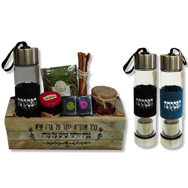 מארז עץ המכיל בקבוק חליטה, חרוסת 120 גרם, חליטת צמחים,חליטת פירות,מקלות קינמון ו-2 קוביות שקיקי תה מבית סרמוני
