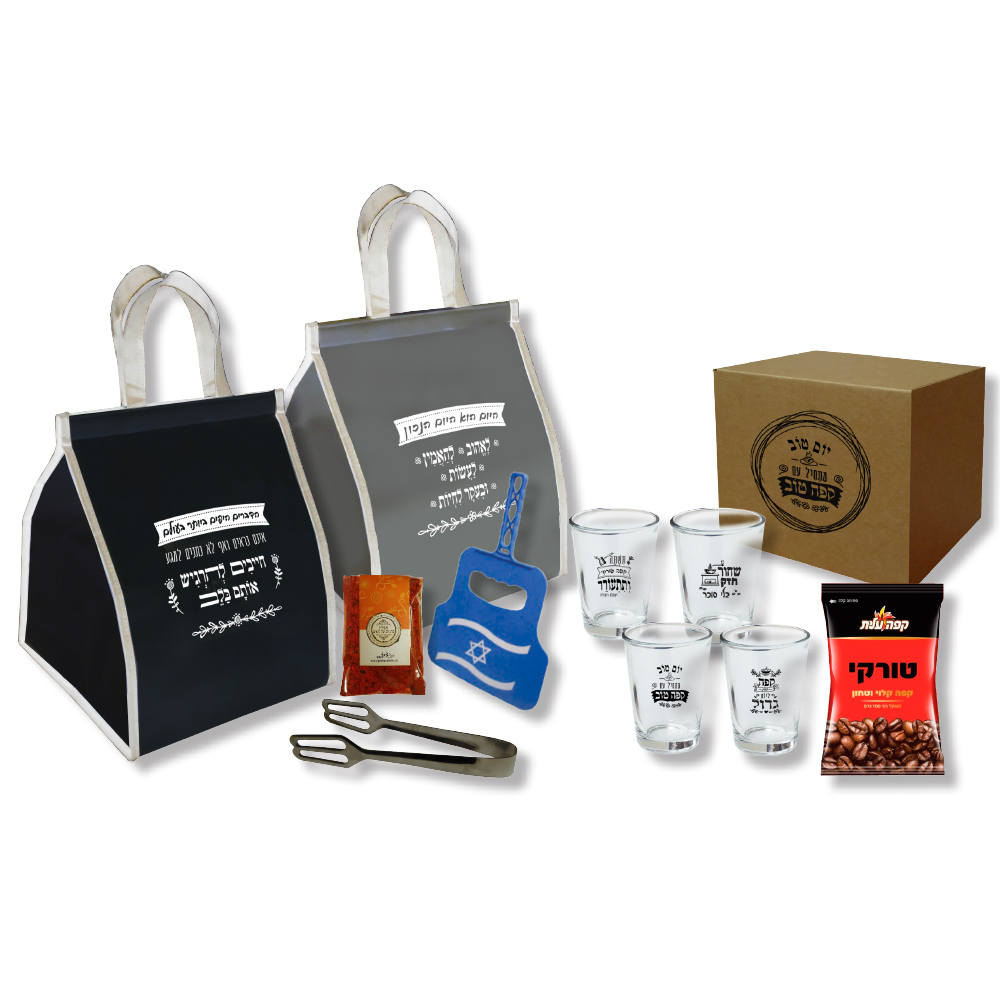 מארז המכיל צידנית משפחתית, מלקחיים למנגל, תערובות למנגל, נפנף, מארז 4 עם כוסות וקפה שחור