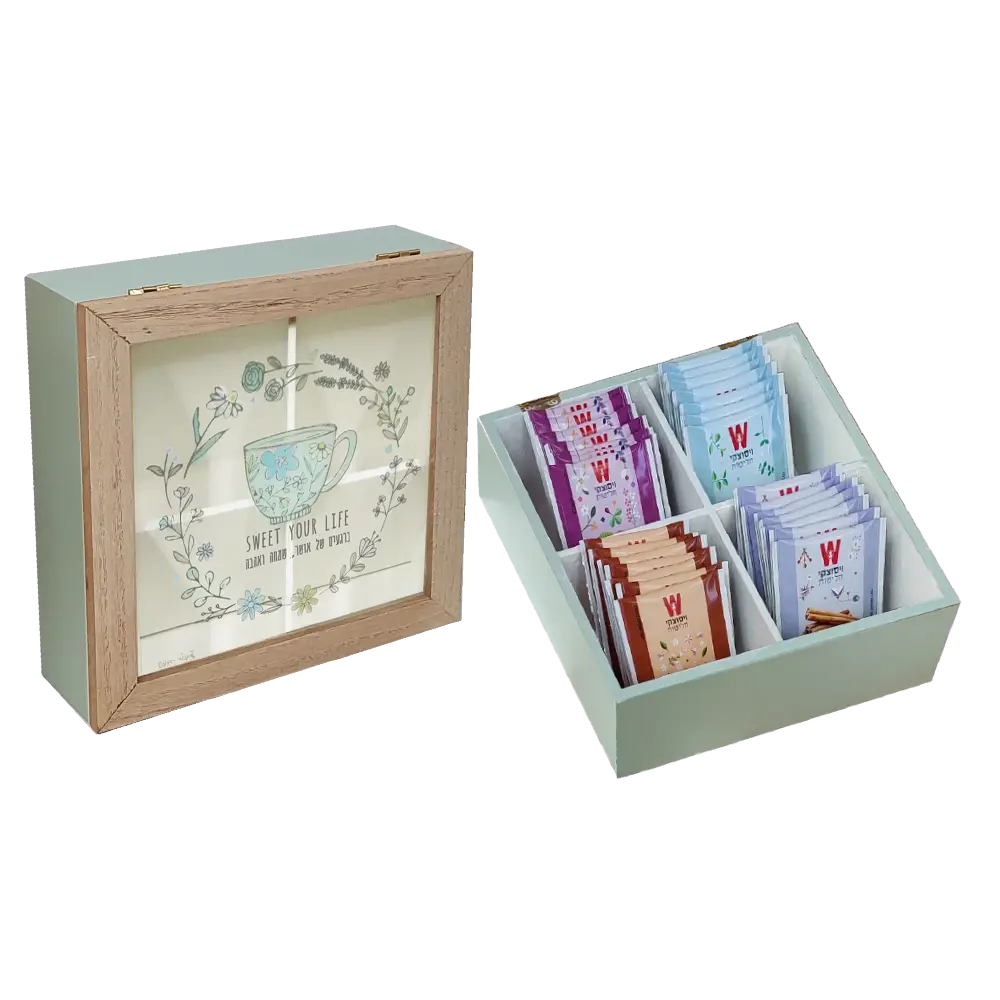 קופסת תה אלגנטית מעץ איכותי, הכוללת 28 תיונים ב־4 סוגי תה שונים (בהתאם למלאי). פתרון אידאלי להפסקת תה נעימה – גם בבית וגם במשרד.