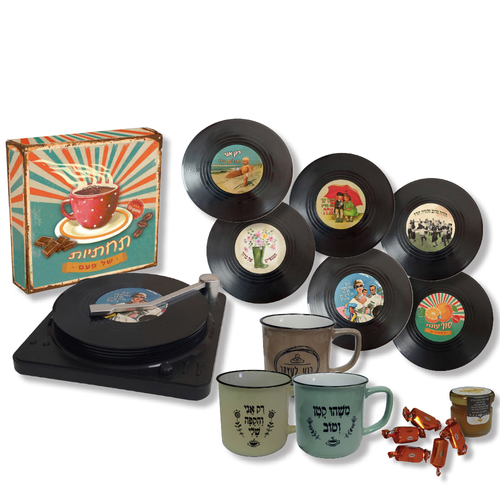 6 תחתיות תקליטים במארז פטיפון מעוצב, ספל וינטג', דבשית 30 גרם ו-5 סוכריות דבש