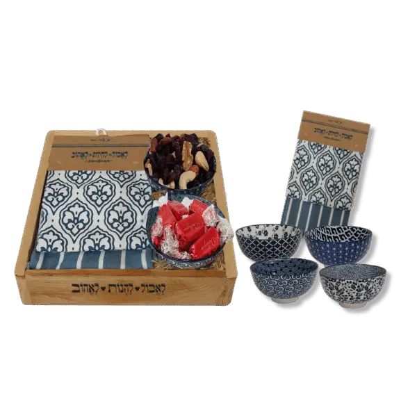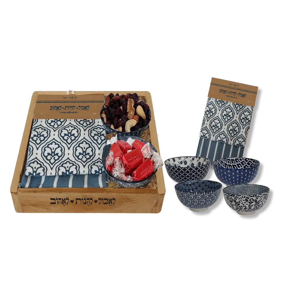 המארז כולל מגש עץ ממוחזר בעבודת יד, 2 קערות קרמיקה מעוצבות, 2 מגבות מטבח איכותיות, 8 פרלינים שוקולדיים ו-200 גרם מיקס בריאות עשיר ומזין.