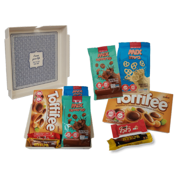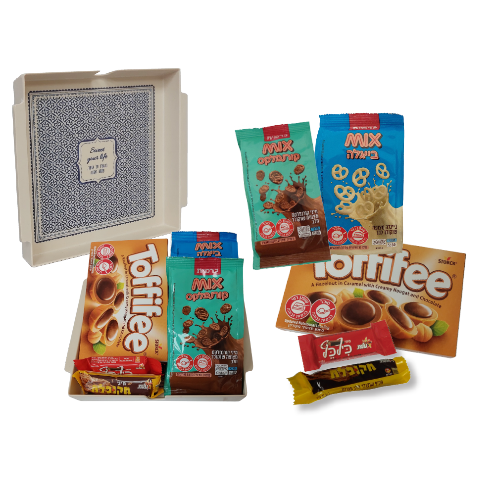 מגש מהודר בגודל 22×20 ס"מ הכולל מתנה עשירה בטעמים – מארז טופיפי, מיקס בייגלה בציפוי שוקולד, מיקס קורנפלקס מצופה, ושני חטיפי שוקולד איכותיים.