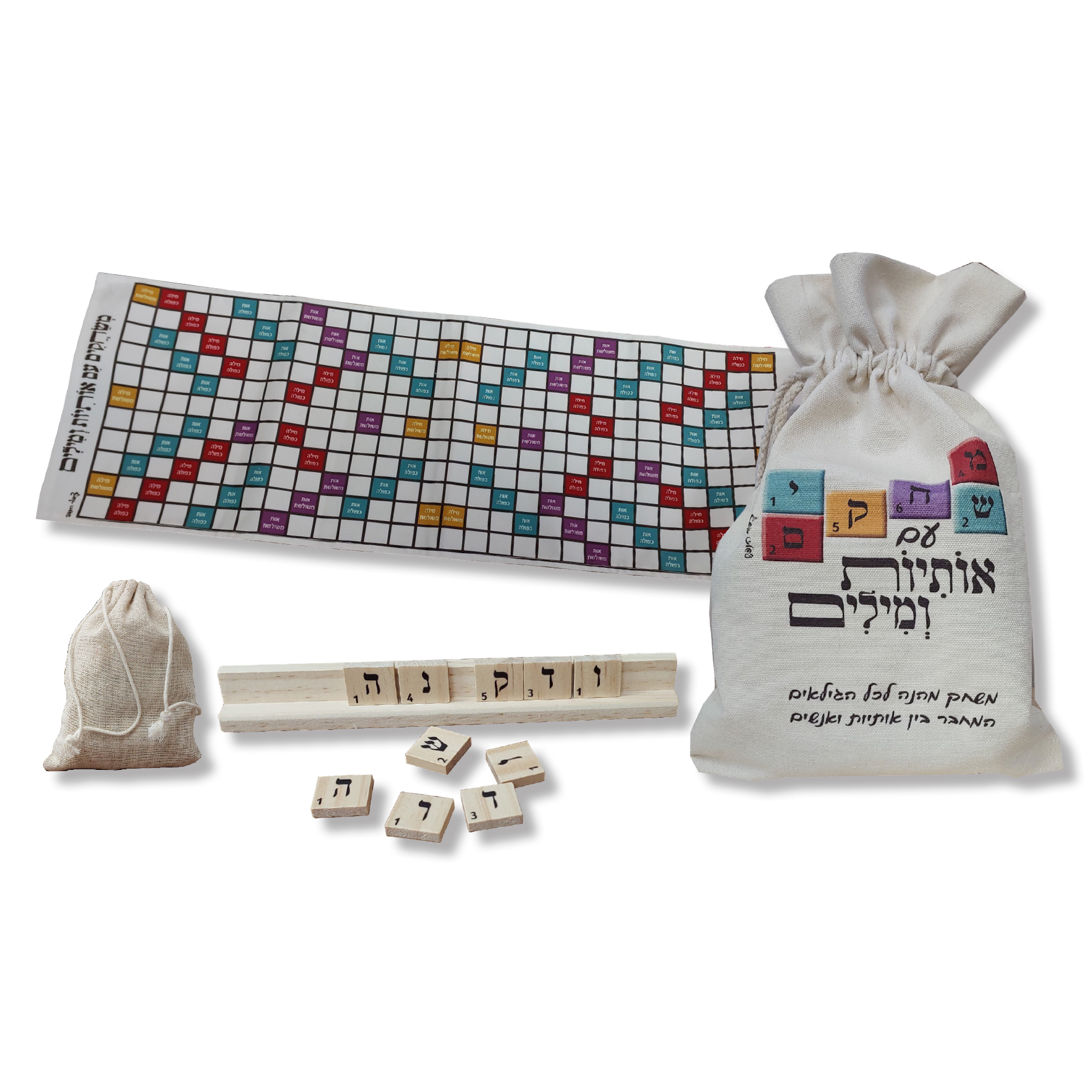 המשחק מכיל 4 לוחות עץ 96 אותיות מודפסות על ריבועי עץ במארז כותנה ולוח משחק