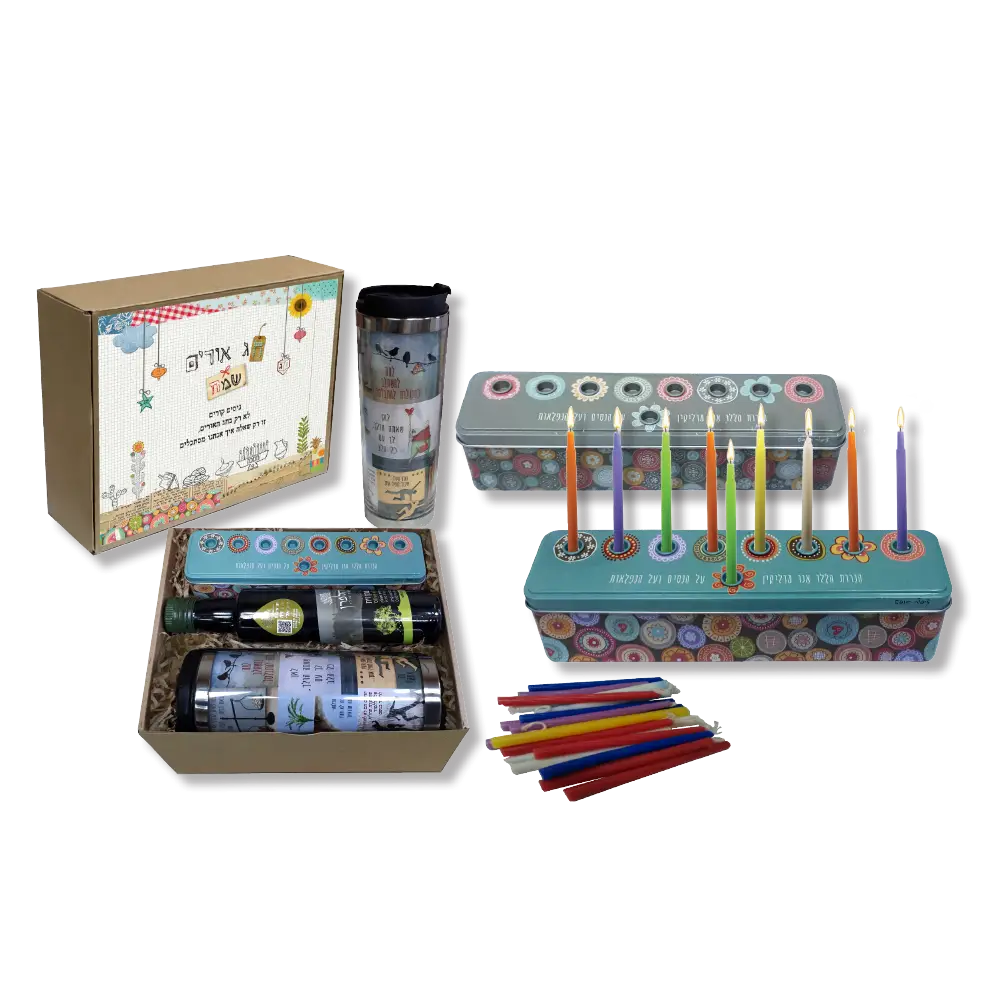 מארז מעוצב לחנוכה המכיל חנוכיית פח עם 44 נרות חנוכה, שמן זית 250 מל' וכוס טרמית