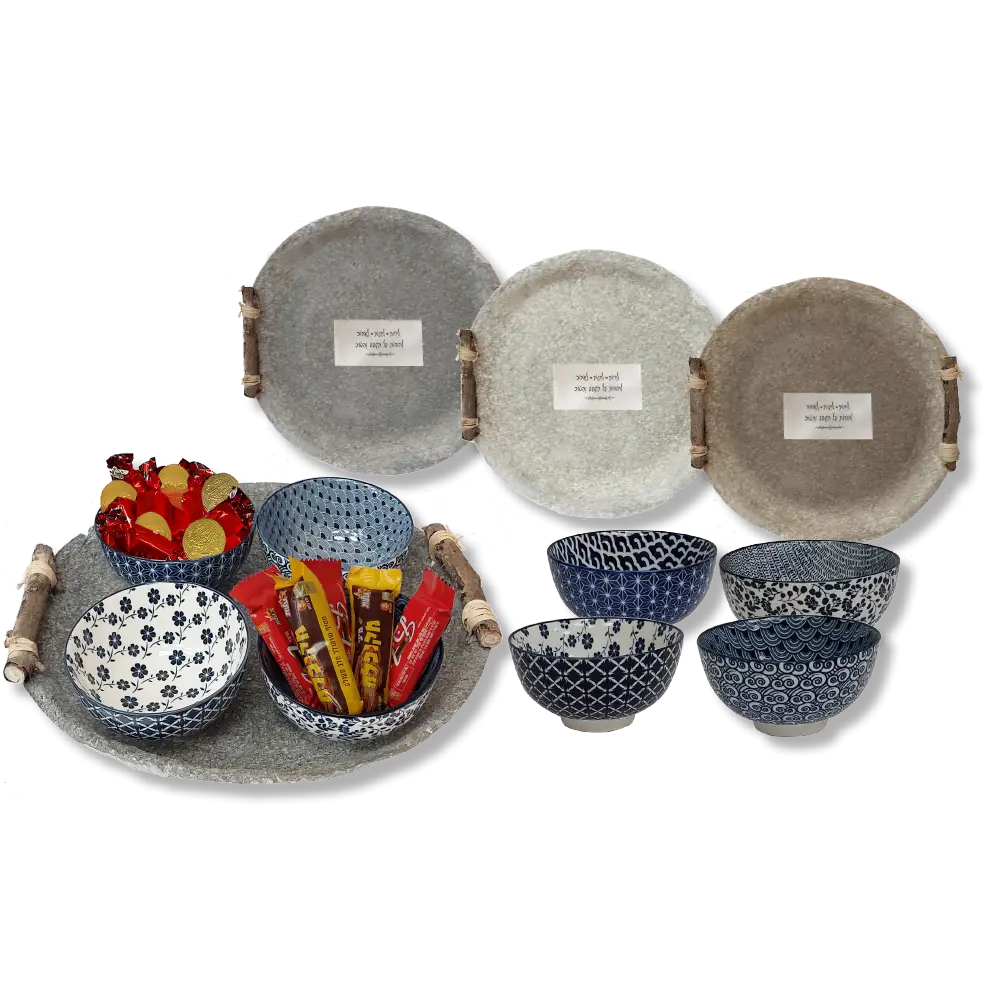 המארז מגיע על גבי מגש מקרמיקה בגימור טבעי, עם ידיות עץ, במראה אותנטי ואומנותי – מושלם כמתנה עסקית מחממת לב.