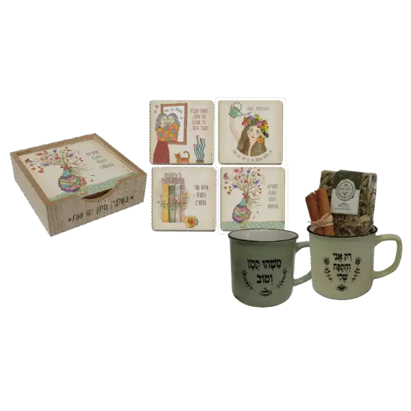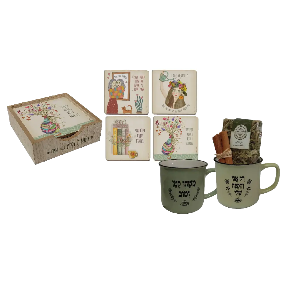 ספל וינטאג' מקסים, סטנד עץ עם ארבע תחתיות בהשראה נשית, תוספת של חליטת תה וקינמון – כל אלו מרכיבים חוויה מושלמת של פינוק והעצמה. מתנה שמזמינה רגע של שקט, חום והתחברות לעצמך. מתאימה במיוחד כמתנת תודה, ימי הולדת או יום האישה.