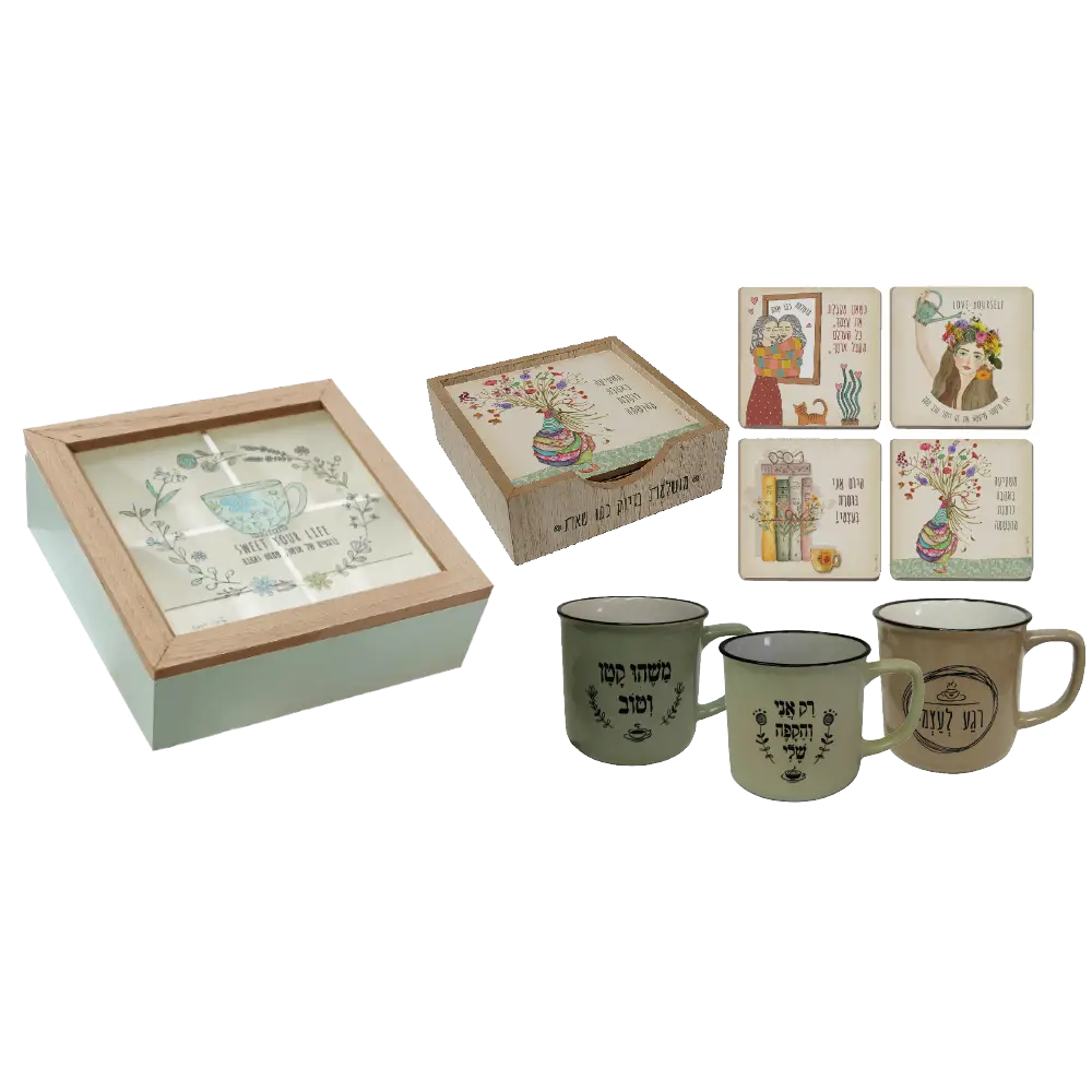 ערכת תה יוקרתית בקופסת עץ, הכוללת שני ספלי וינטאג', סטנד עם ארבע תחתיות עץ מעוצבות, ומשפטי העצמה מרגשים במיוחד עבור נשים. שילוב של פרקטיות, ניחוח נוסטלגי וסטייל על זמני – מתנה מושלמת לחיזוק קשרים אישיים ועסקיים כאחד.