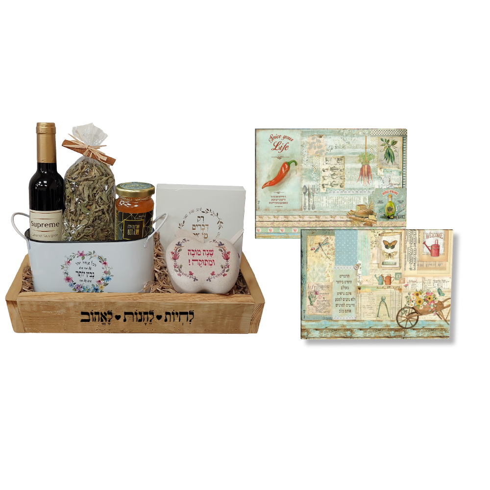 המתנה כוללת קופסת פח עם בקבוק יין (375 מ"ל), חליטת צמחים ארומטית, מקלות קינמון, דבש מובחר (120 גרם), כלי דבש מעוצב מבמבוק בשילוב מלמין עם כפית תואמת, מארז שוקולד נפוליטנים, וקרש חיתוך מזכוכית איכותית בגודל 35×25 ס"מ.