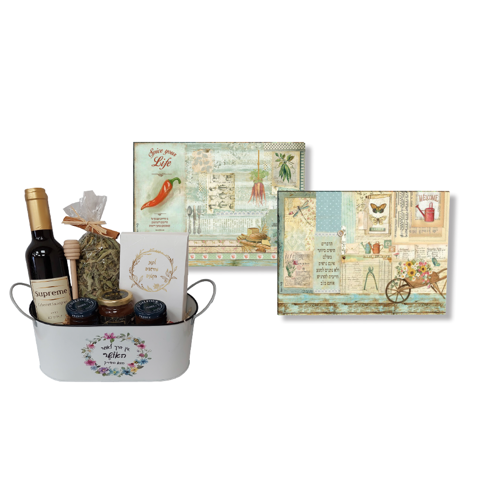 המארז כולל בקבוק יין (375 מ"ל), מארז שוקולד ספיר לבן עם בוטן בעיטוף שוקולד לבן וקרמל מלוח, דבש מובחר במשקל 120 גרם, כפית דבש חגיגית, שתי חליטות פירות, חליטת צמחים ארומטית, מקלות קינמון וקרש חיתוך מזכוכית בגודל 35×25 ס"מ.