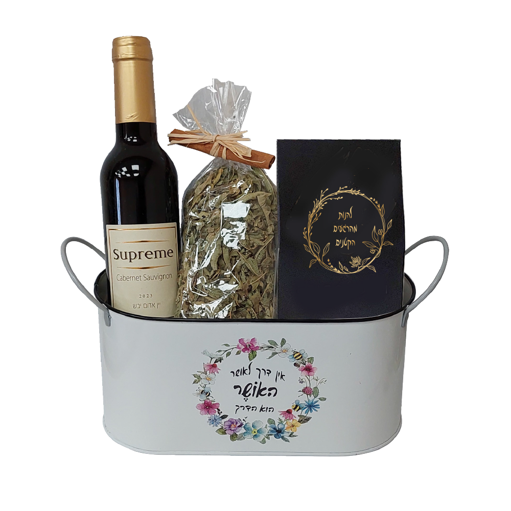 מארז מתנה חגיגי ומפנק לראש השנה, הכולל יין איכותי (375 מ"ל), קופסת שוקולדים פרימיום מסדרת "ספיר" – צימוק בעיטוף שוקולד לבן, וחליטת צמחים מרגיעה. כל הפריטים מגיעים בתוך מארז פח מהודר במידות 24x12x12 ס"מ – עיצוב קלאסי שמעניק תחושת יוקרה וחשיבה אישית.
