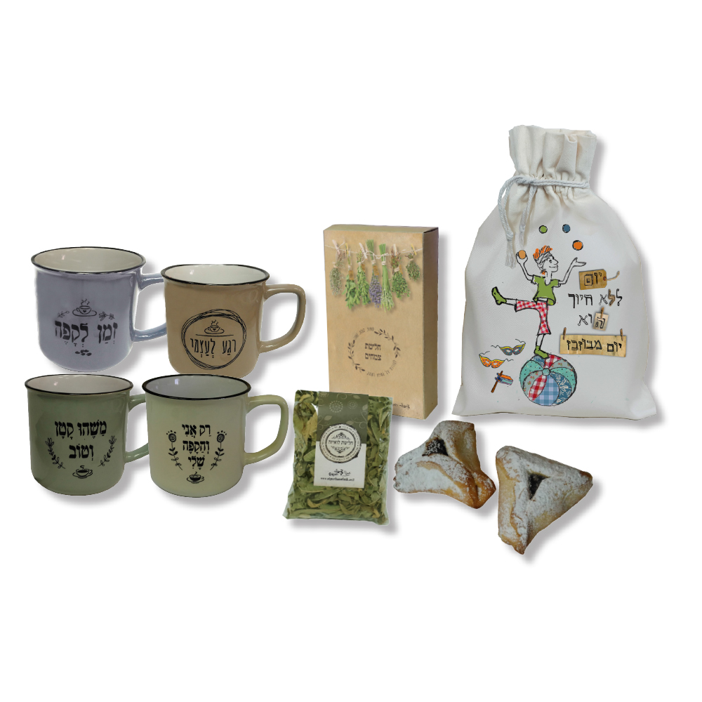 מארז ארז לפורים – שקית כותנה עם ספל וינטג' אחד, 2 אוזני המן, חליטת צמחים ומקלות קינמון גדולים