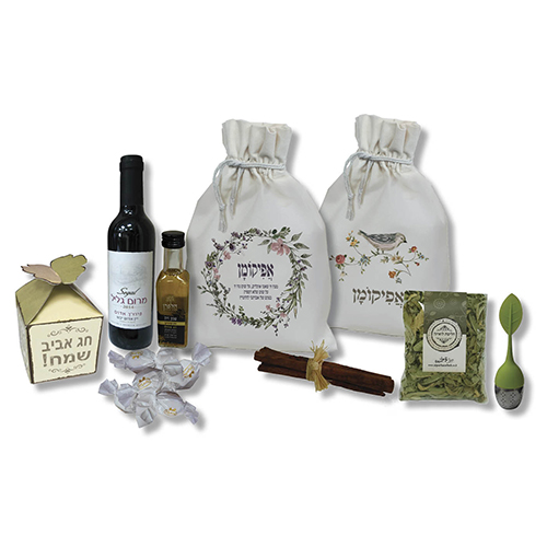 מארז אדר לפסח המכיל שקית לאפיקומן עם יין 375 מ"ל, שמן זית 100 מ"ל, קופסת פרפר עם 5 פרלינים, חליטת צמחים, כפית חליטה ומקלות קינמון ארוכים