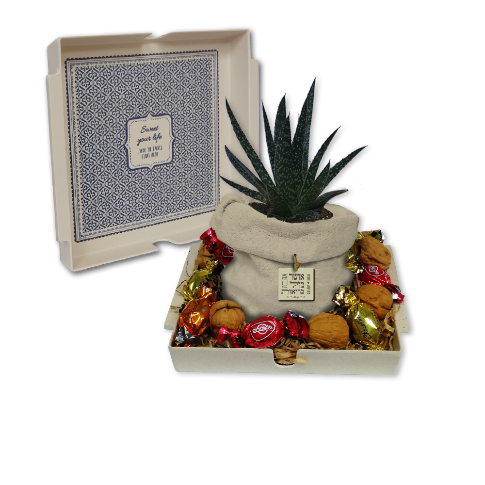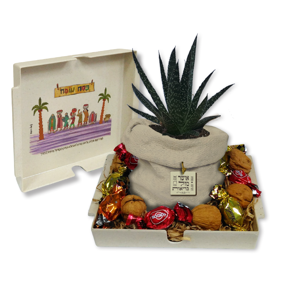 מארז אלירז לפסח המכיל – מגש למצה מבמבוק בשילוב מלמין, סקולנט בעציץ בטון שק, 6 אגוזי מלך ו-8 פרלינים