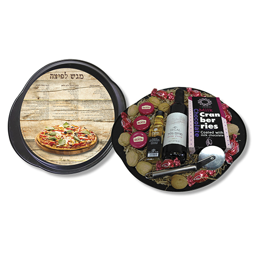 מארז ברוש לפסח המכיל מגש לפיצה משפחתית, גלגלת לחיתוך, יין 375 מ"ל, שמן זית 100 מל', מארז שוקולדים בטעמים שונים: צימוקיםחמוציותבוטנים בציפוי שוקולד, 3 ממרחים מתוקים 30 גר', 7 פרלינים ו-8 אגוזי מלך