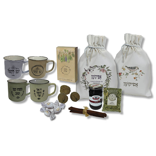 מארז גיא לפסח המכיל שקית לאפיקומן עם ספל וינטג' אחד, 3 פרלינים, 3 אגוזים, חרוסת 120 גר', חליטת צמחים ומקלות קינמון גדולים