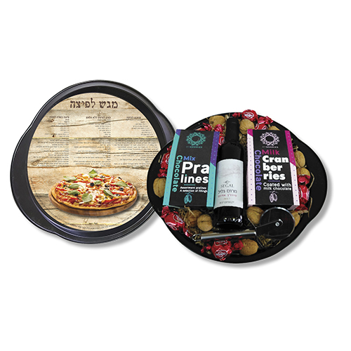 מגש לפיצה משפחתית, גלגלת לחיתוך, יין 375 מ"ל, 2 מארזי שוקולדים בטעמים שונים: צימוקיםחמוציותבוטנים בציפוי שוקולד, 10 אגוזי מלך ו-7 פרלינים