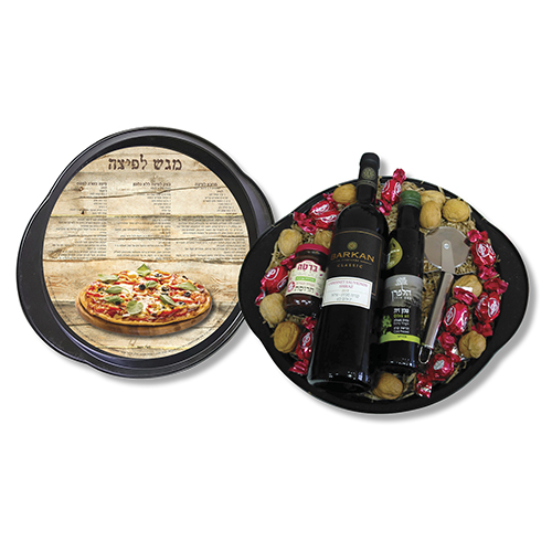 מארז ליבנה לפסח המכיל מגש לפיצה משפחתית, גלגלת לחיתוך, יין 750 מ"ל, שמן זית 250 מ"ל, חרוסת 120 גר', 12 אגוזי מלך ו-10 פרלינים