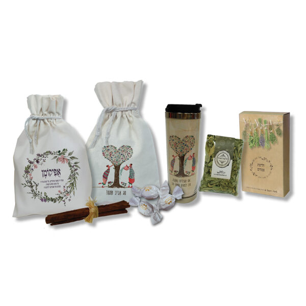 מארז מירון מכיל שקית כותנה עם כוס טרמית, 3 פרלינים, חליטת צמחים ומקלות קינמון גדולים