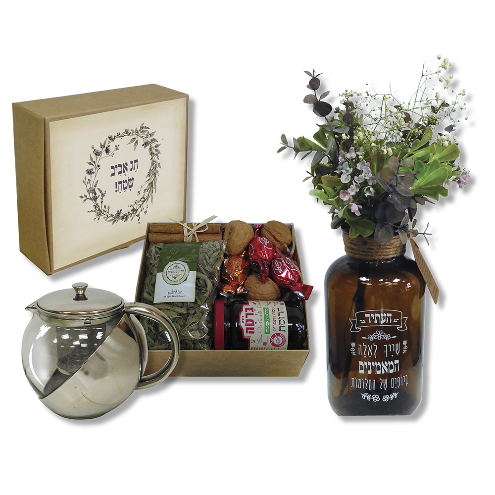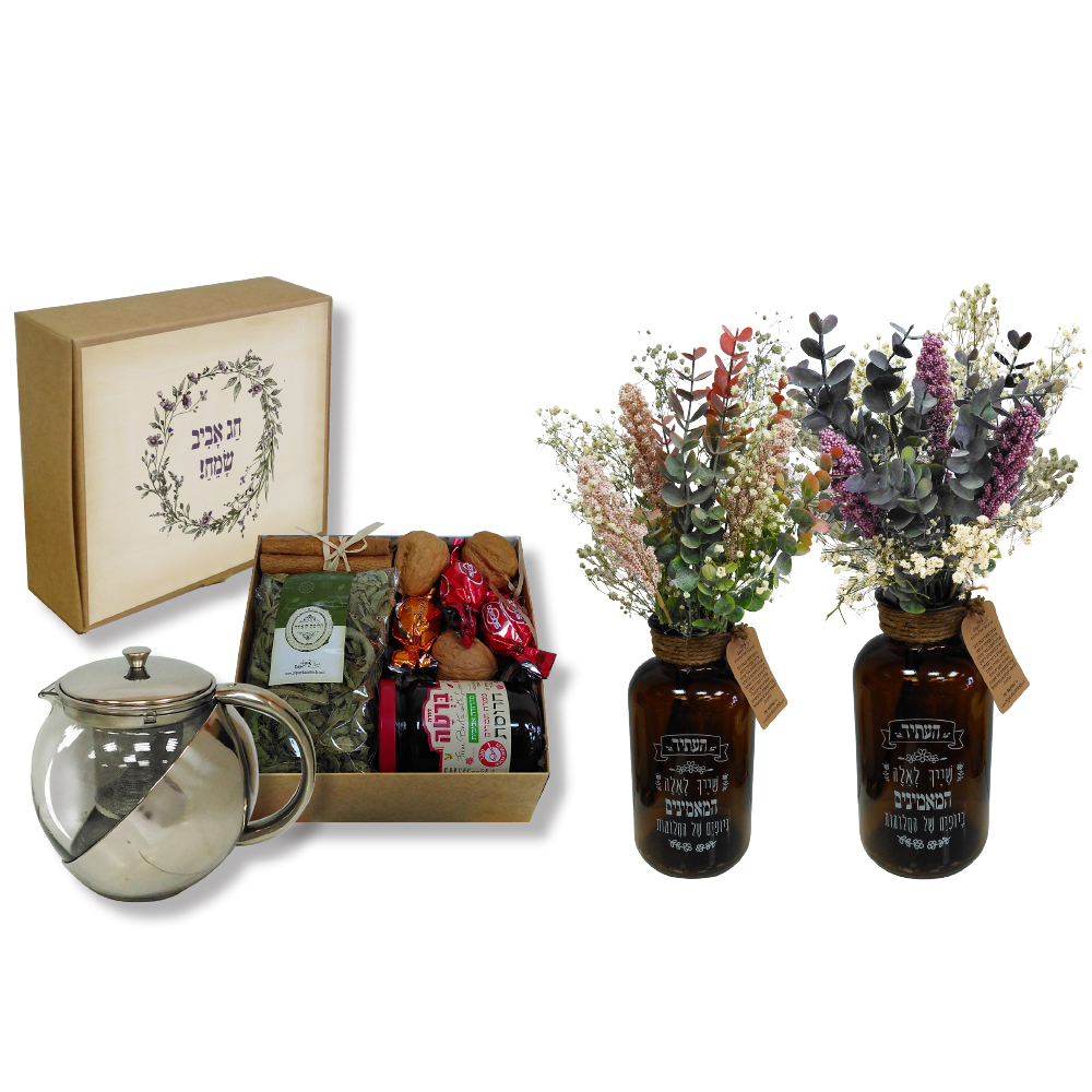 קנקן לחליטה, אגרטל מזכוכית חומה עם פרחים מיובשים בשילוב עם צמחים מלאכותיים, מארז עם חרוסת, 3 פרלינים, 3 אגוזי מלך, חליטת צמחים ומקלות קינמון.